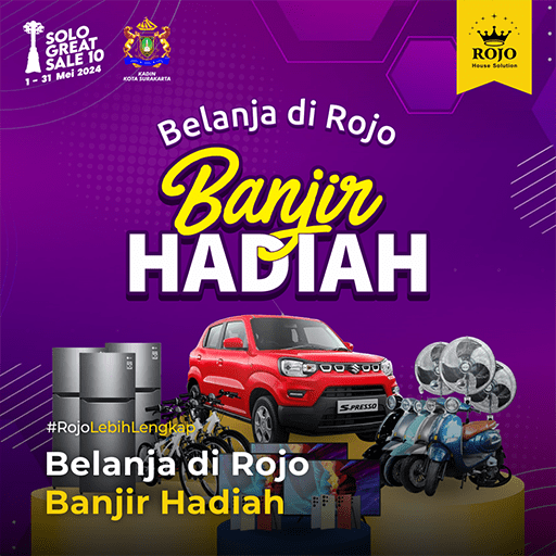 Rojo House Solution kembali mendukung kegiatan Solo Great Sale 2024 dengan menjadi salah satu tenant SGS 2024. Kegiatan yang diselenggarakan oleh Kadin Surakarta bersama dengan Pemerintah Kota Surakarta ini bertujuan untuk mendorong peningkatan perekonomian di Kota Surakarta. Bagi Sobat Rojo yang berbelanja di seluruh cabang Rojo House Solution selama periode SGS 2024 berlangsung, mendapat kesempatan untuk memenangkan hadiah undian berupa mobil, sepeda motor, Tv, smartphone dan masih banyak lagi.